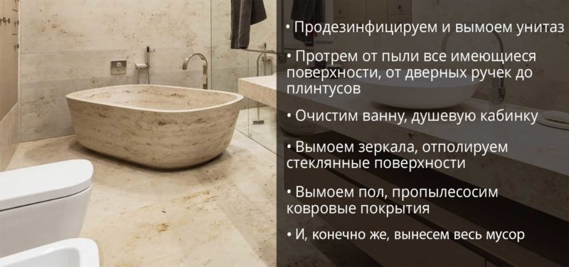 - Наведение порядка в санузле, с дезинфекцией ванны, душа, унитаза и раковины;
